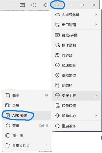 - 在模拟器窗口。左上角“。。。”按钮,更多工具菜单,“APK安装”选项