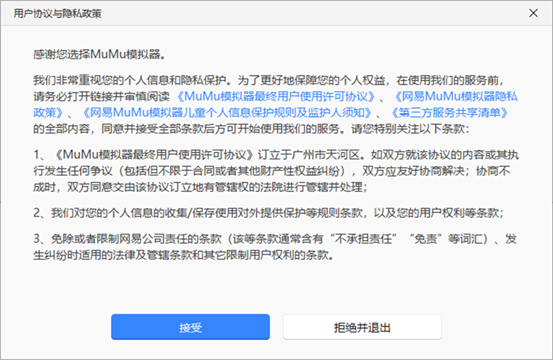 - 完成安装后,会打开隐私政策窗口。请详细阅读隐私政策内容,同意则点击“接受”进入下一步。